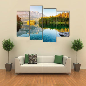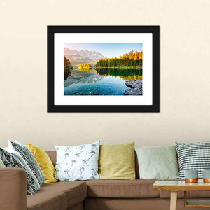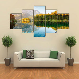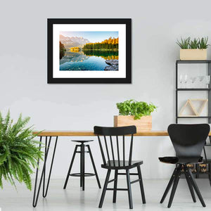A realistic landscape of mountains, a clear lake and forest caught in morning sunlight, with crisp reflections on the water. The scene reads serene, majestic and tranquil and pairs well with modern home and room decor.
