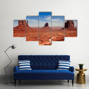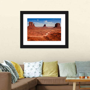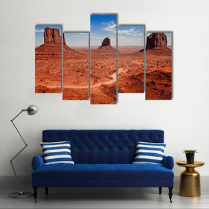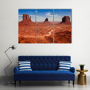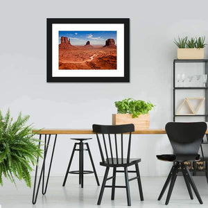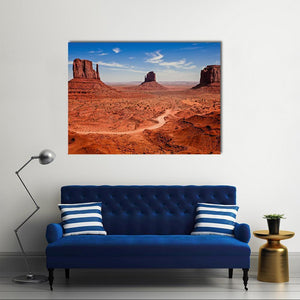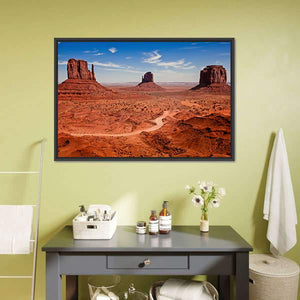 Famous Monuments Valley Canvas Wall Art shows red rock buttes, a winding dirt road and a wide blue sky in a photorealistic, rustic style. The scene feels vast, arid and serene — a natural fit for modern or rustic living rooms and entryways that favour nature-focused wall decor.