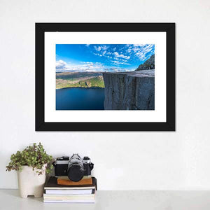 This breathtaking landscape captures a serene view of Pulpit Rock in Norway, featuring a dramatic cliff overlooking a tranquil lake. With its expansive blue sky and earthy tones, this art piece invites awe and contemplation.