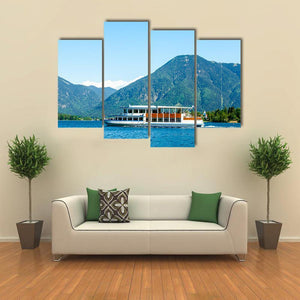 A realistic view of Tegernsee Lake featuring a white passenger boat on blue water, set against tree-lined mountains. The daytime scene uses blues, greens, white and brown to create a serene, peaceful atmosphere that suits modern or nature-themed rooms.
