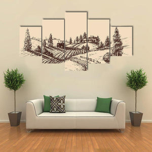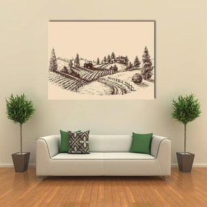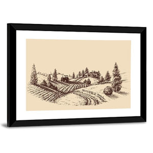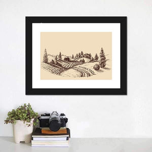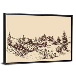 This canvas art captures a serene farm scene with a detailed etching of rolling hills, a tractor, and rustic houses. The soft palette of browns and beiges evokes a peaceful, rural atmosphere, making it a lovely addition to any wall decor.