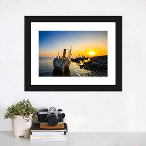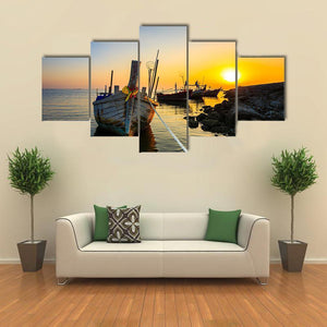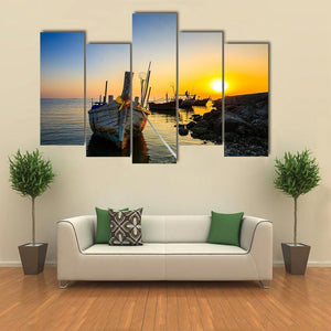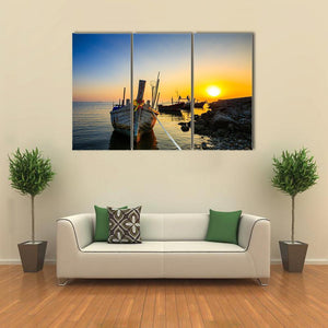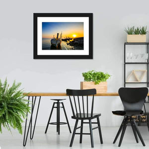 This canvas depicts a fishing boat moored at the shore as a sunset washes the ocean in blue, orange and yellow tones, creating a peaceful, warm mood. Details like the rope tethering the boat, fishing nets and nearby rocks give the scene a calm, coastal feel that works well in modern or coastal home interiors.