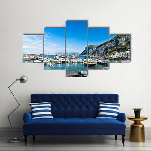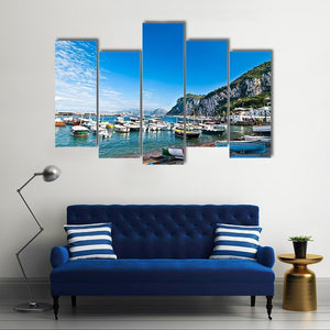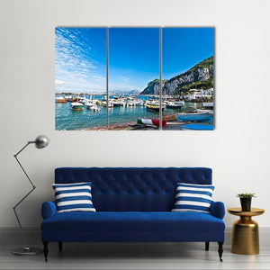 This vibrant canvas captures a serene scene of fishing boats docked in a clear blue harbor on Capri Island. With its realistic depiction of boats, cliffs, and wispy clouds, it’s perfect for bringing a coastal vibe to your home.