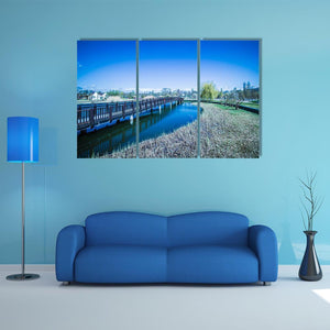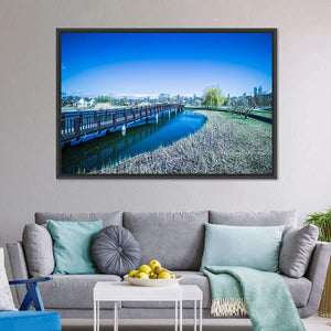 A realistic landscape of a garden in Vienna, centered on a wooden bridge over calm water with trees, buildings and dry reeds along the bank. The blue, green and brown palette creates a peaceful, bright, serene mood. Works well in modern or nature-inspired rooms.