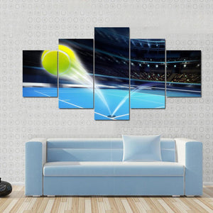This modern canvas art piece features a tennis ball soaring above a blue tennis court, capturing the dynamic energy of the sport. With light trails and vivid colors, it adds a lively touch to any room.
