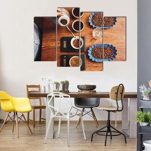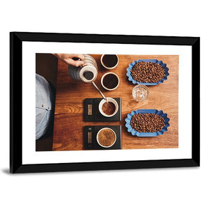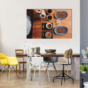 This canvas art captures a meticulous coffee preparation scene with an overhead shot of drinkware and scales. The calming palette of browns, blues, and grays evokes a focused, artisanal feel, making it a perfect addition to modern home decor.