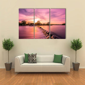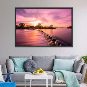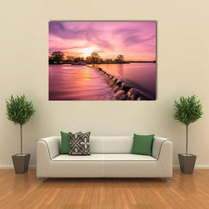 Fox River Dam Canvas Wall Art shows a sunset river and long-exposure waterfall set among trees, rendered in photorealistic pink, purple, orange and brown tones. The scene feels serene and tranquil, with soft flowing water and warm sunset light. It fits well in modern home décor as a calm nature-focused wall art for living rooms or bedrooms.