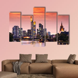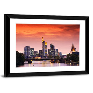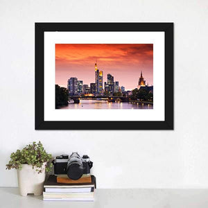 Frankfurt's skyline glows after sunset in this modern cityscape print, with skyscrapers, a river and a bridge beneath a dramatic orange-and-blue sky. Glowing windows and soft gray tones produce a vibrant yet tranquil urban mood that suits contemporary living rooms or offices.