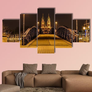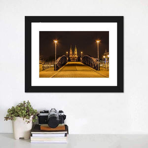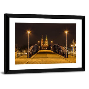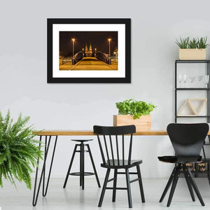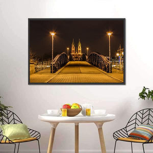 Freiburg Town At Night shows a nighttime town scene with a wooden bridge, illuminated church spires and streetlights. Rendered realistically in warm orange, dark brown, black and yellow, the image feels calm and inviting. It suits modern, city-inspired rooms seeking subtle architectural and evening light accents.