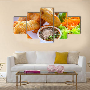 Close-up food photography of crispy fried chicken wings with a dipping sauce topped with chopped green onions, plus lettuce and shredded carrots. The warm golden-brown, green and orange palette feels appetizing and comforting, a natural fit for a kitchen, dining area, or casual restaurant wall.
