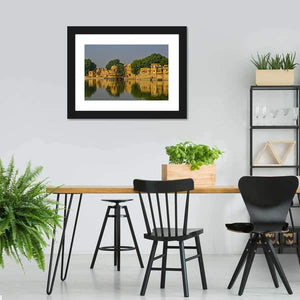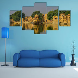 This realistic canvas depicts Hindu temples in Jaisalmer beside a calm lake, with golden-hued domed buildings, trees and clear water reflections. The rule-of-thirds composition and a palette of yellow, green, blue and brown give the scene a serene, historic, picturesque feel that fits modern or traditional room decor.