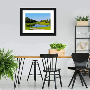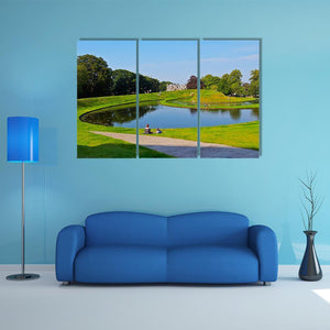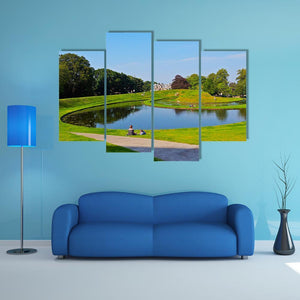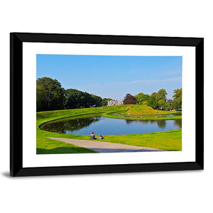 This beautiful canvas art captures a serene lakeside scene with a grassy hill, trees, and people enjoying nature. The calming blues and greens create a peaceful atmosphere, making it a perfect addition to any room.