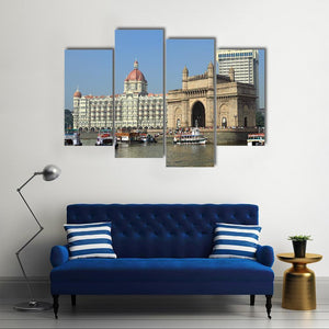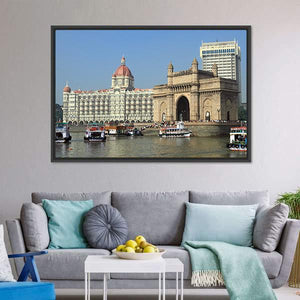 This canvas features the majestic Gateway of India against a clear blue sky. The realistic depiction captures the grandeur of the Taj Mahal Palace Hotel and surrounding boats, creating a vibrant cityscape that brings a sense of place and tranquility to your wall.