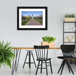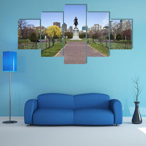 This landscape canvas features a striking statue of George Washington on horseback, set against a vibrant city skyline. The peaceful scene, with its bright blue sky and lush greenery, invites a sense of calm and admiration.