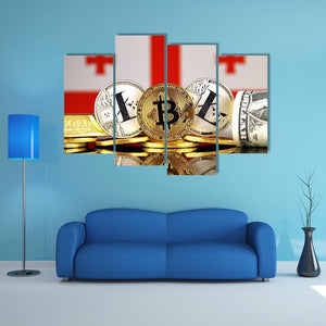 This captivating canvas art features the Georgian flag, beautifully juxtaposed with Bitcoin and Litecoin coins amidst a backdrop of gold and silver. The modern, symmetrical design radiates a sense of wealth and technology.