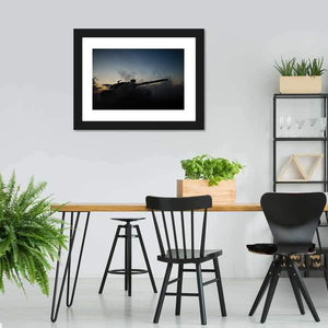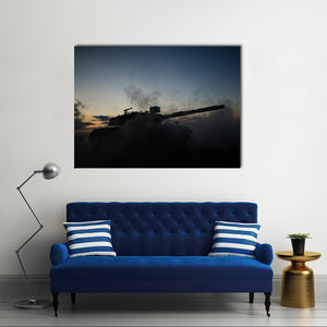 Silhouette of a German tank set against a dusk sky, partially obscured by smoke with sunset colors on the horizon. The atmospheric image uses blue, grey, orange and black tones in a composition with depth and dramatic tension. It fits modern or military-themed rooms as a moody focal piece.