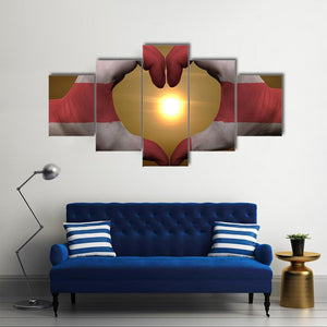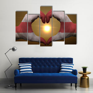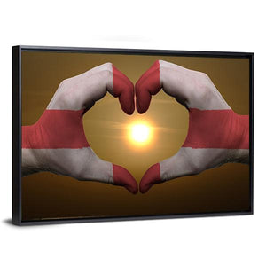 This canvas art features hands forming a heart shape, beautifully painted in the colors of the England flag. The romantic and patriotic vibe is enhanced by a sunburst backdrop, creating a hopeful atmosphere.