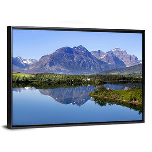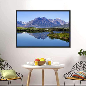 Capture the serenity of Glacier National Park with this stunning wall art featuring majestic mountains, a serene lake, and beautiful reflections. The calming blue and green palette makes it a perfect addition to any nature-inspired décor.