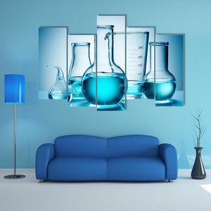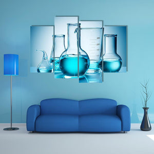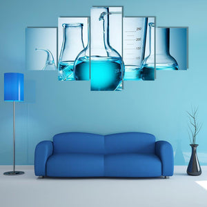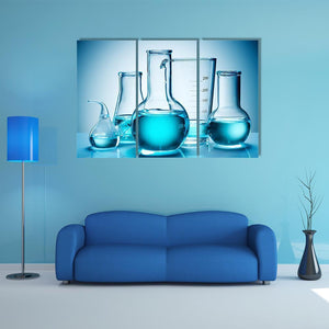 A clean, modern canvas showing laboratory glassware—graduated cylinders and various flasks with blue liquid—arranged in a symmetric composition. The blue, light-blue, and white palette gives a scientific, minimalist mood that fits home or lab-inspired room decor.