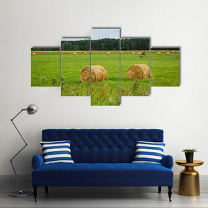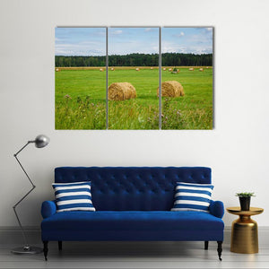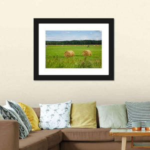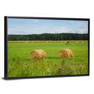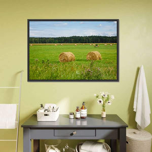 This canvas wall art features two large hay bales resting peacefully in a lush green field under a serene sky. The rustic charm of the landscape evokes a natural and tranquil atmosphere, making it a lovely addition to any room that embraces a rural aesthetic.
