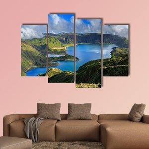 A realistic aerial landscape showing interconnected crater lakes, lush green hills, blue water and soft clouds on San Miguel Island in the Azores. The scene feels serene and vast, with a natural, calming palette that works well in modern or nature-focused rooms.