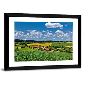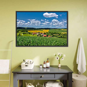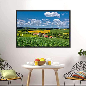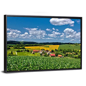 Green Village, Croatia shows a peaceful farmhouse tucked into sunlit fields beneath a summer sky. Rendered realistically with greens, blues, yellows and whites, the composition highlights fluffy white clouds, red-roofed buildings and bands of yellow flowering plants for an idyllic, vibrant mood. Fits modern or nature-inspired interiors.