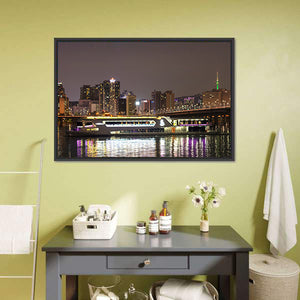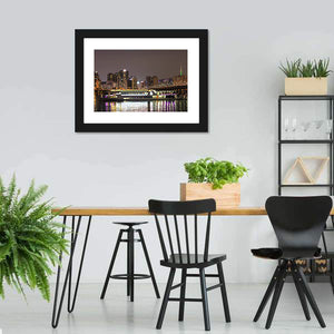 This canvas depicts the Han River and Seoul skyline at night, with a lit bridge, boats on the water, and stars above. The modern, colorful palette of blues, purples, white, yellow and gray and the lights reflecting on the river create a vibrant, urban mood that suits modern living rooms and urban interiors.