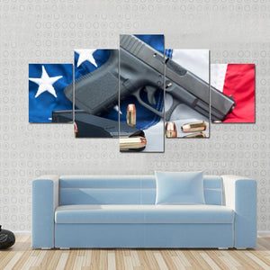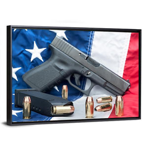 This powerful canvas art features a striking close-up of a handgun, loose bullets, and the American flag, creating a serious and patriotic atmosphere. Its bold colors of red, white, and blue, along with accents of black and gold, make it a captivating addition to any wall.