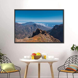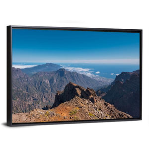 Roque De Los Muchachos Canvas Wall Art shows a wide mountain range with jagged rocky peaks meeting the ocean under wispy clouds and a clear blue sky. The realistic, high-angle composition creates depth and a majestic, serene atmosphere. Suits modern interiors and room decor that favor nature-focused landscape pieces.