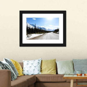 Kootenay Highway, Canada captures a winter road framed by coniferous trees and distant snow-covered mountains, with sun flares and leading lines that draw the eye into the scene. The realistic image uses a cool blue, white, green and grey palette and feels serene, vast, and open. Works well in modern living spaces that favor calm, natural tones.