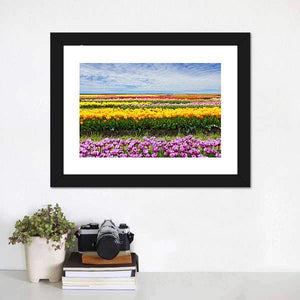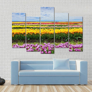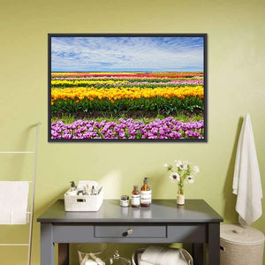 Bring the beauty of a vibrant tulip field into your home with this colorful canvas wall art. The realistic depiction captures cheerful rows of tulips beneath a bright sky, adding a peaceful touch to any space.