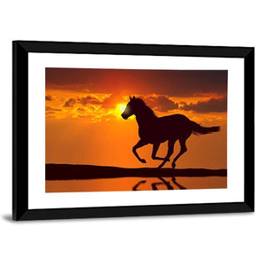 This canvas art depicts a powerful silhouette of a horse in mid-gallop against a serene sunset backdrop. The vibrant palette of orange, black, and yellow captures a moment of freedom and elegance, making it a beautiful addition to any space.
