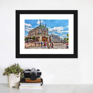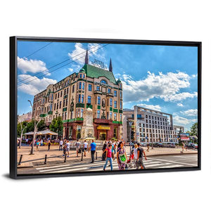 A photorealistic cityscape of Hotel Moskva and Balkanska Street, showing an ornate building with a green pitched roof and people crossing the street. The green, blue, beige and white palette creates a vibrant, lively urban mood that works well in modern living rooms or city-inspired offices.