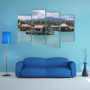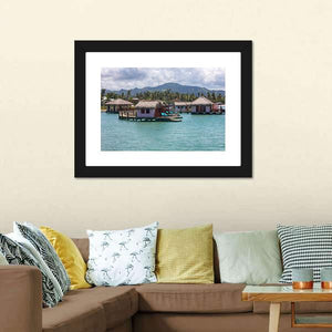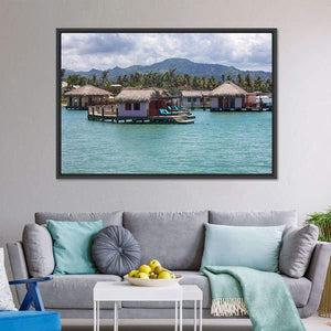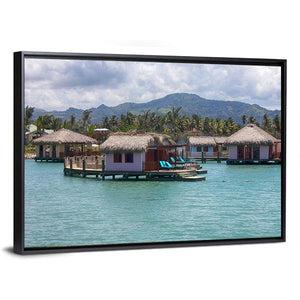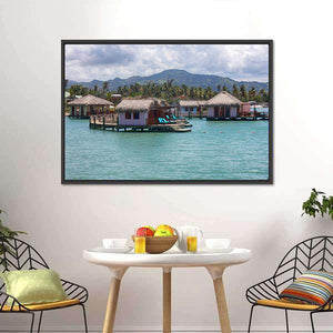 Houses In Water In Amber shows overwater bungalows and a tropical island rendered in calm blue, green and brown tones. The scene feels serene and vacation-like, with thatched roofs, lounge chairs on decks and palm trees. It suits beach-themed or modern rooms as a relaxed focal piece.