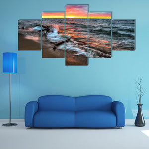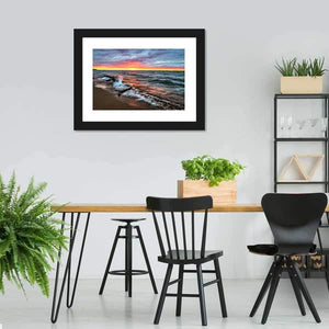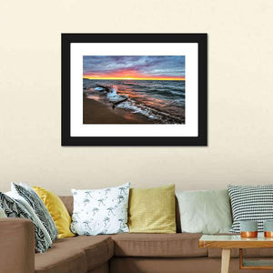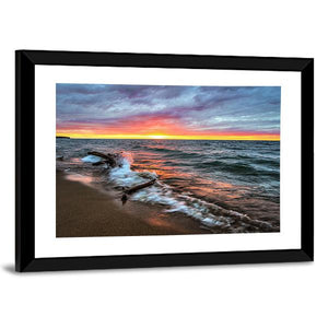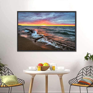 This horizontal canvas captures the serene beauty of Huron Lake at sunset, featuring vibrant hues of orange, pink, and purple. The dramatic clouds and crashing waves create a tranquil yet dynamic scene, perfect for enhancing your home decor.