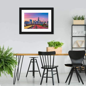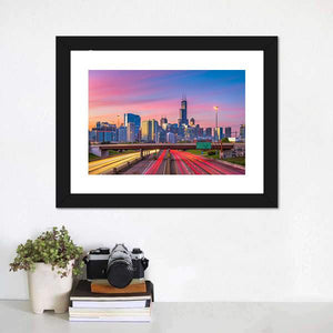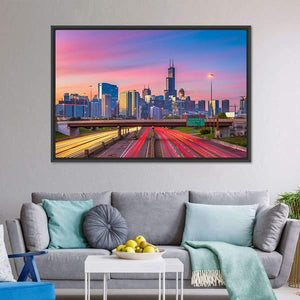 This photographic canvas shows an Illinois downtown skyline with streaking highway traffic and tall skyscrapers at dusk. A wide-angle, elevated perspective highlights light trails and a lively pink, blue, orange and yellow palette for an energetic, vibrant mood. Suited to modern, urban-inspired living spaces and room decor that favors bold, colorful imagery.