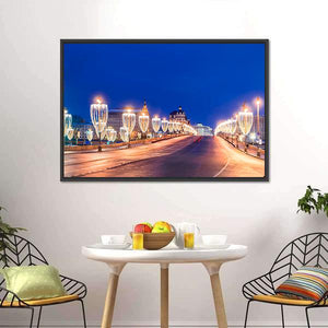 This canvas captures a Moscow bridge lined with ornate lamp posts and city lights, the road receding into the distance on a winter night. Cool blues, gold highlights, and soft grays give a festive, enchanting, and serene cityscape that fits modern room decor.
