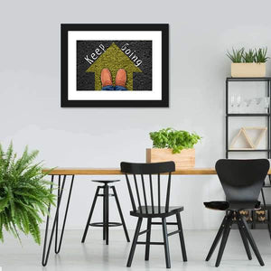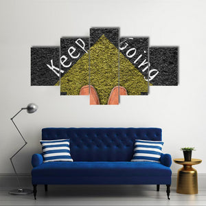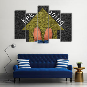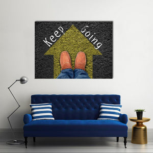 This canvas features the short phrase Keep going in white text across a clean yellow, black and white palette that reads motivational and direct. The framed perspective shows an arrow pointing forward and a pair of loafers in jeans, giving the work a modern, minimalist feel that suits home and room décor.