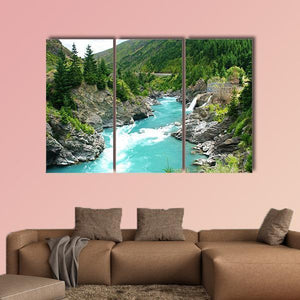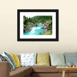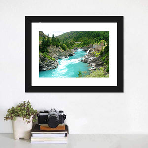 Kawarau River near Queenstown, New Zealand appears from a high-angle viewpoint, with a narrowing rocky gorge, white water rapids, pine trees, and a small waterfall. Cool blues and greens with gray-brown accents create a vibrant, refreshing, and serene scene that works well in modern, nature-focused rooms.