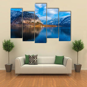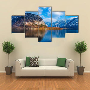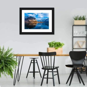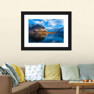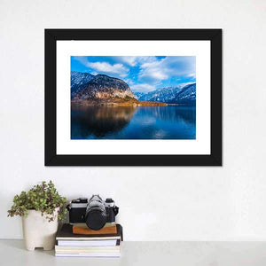 This realistic nature photograph captures an Austrian lake and partially snow-covered mountains, their forms mirrored in clear water beneath a blue sky with white clouds. Calm and majestic, the print works well in living rooms, home offices, or entryways that favor tranquil, nature-focused décor.