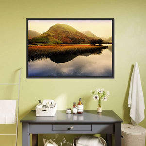 District Lake, England presents a realistic landscape of a mountain with terraced fields, grassy shore and tall reeds, with calm water reflecting the scene. Rendered in greens, browns, golds and blues and touched by late‑afternoon autumn light, the image feels serene and peaceful. This canvas print fits nature‑inspired or modern rooms and works well as understated wall decor.