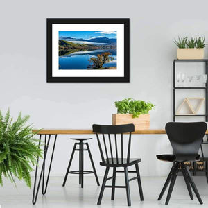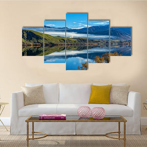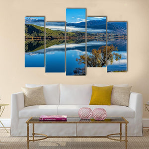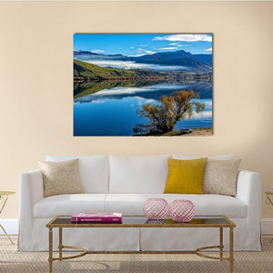 Lake Hayes Canvas Wall Art depicts a photorealistic lakeside scene with misty mountains, a tree with yellow leaves, and a white car parked on the bank, all mirrored clearly in the water. Quiet blues and soft greens create a serene, peaceful, majestic morning atmosphere that suits modern, nature-inspired rooms like living rooms or offices.