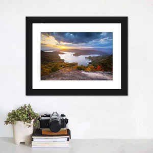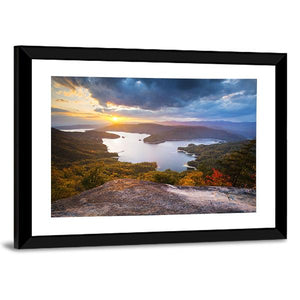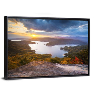 Lake Jocassee US Canvas Art captures a high-angle view of a lake set among mountains and forest under a sunset sky. Stormy grey clouds give way to sun breaking through, creating a serene yet dramatic scene that suits modern living rooms, bedrooms, or entryways.