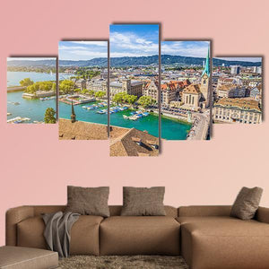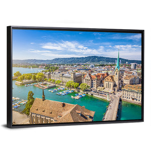 This photorealistic canvas shows an aerial view of Lake Zurich with the city skyline, river and bridge, plus boats on the water and a twin‑spired church. The scene feels vibrant, bustling and sunlit, with blue, green, brown and white tones. Suited to modern living rooms or office wall decor.