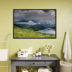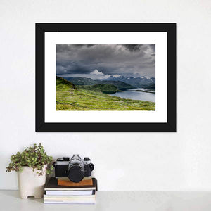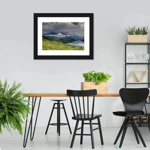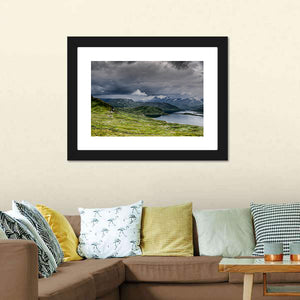 A wide-angle nature photograph of a European lake set beneath snow-capped peaks and rolling hills, with dark storm clouds creating depth and contrast. Greens, blues, gray and white deliver a dramatic yet serene, vast mood—well suited to modern living rooms or offices.