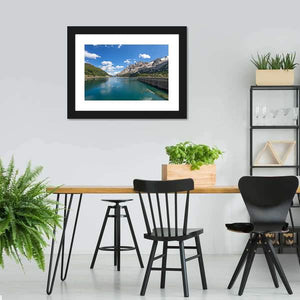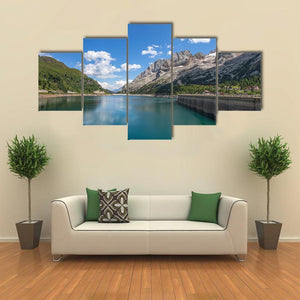 Fedaia Lake, Italy Canvas Wall Art depicts a photorealistic mountain lake scene with snow-capped peaks, a blue sky with white clouds, and a dam in the distance. Reflections on the water and coniferous trees along the hillsides give the image a serene, grand, majestic feel that works well in modern living rooms or home offices.
