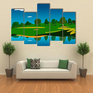 This printed artwork depicts a forest beside a calm lake with flat graphic trees, stylized clouds, and a symmetric water reflection. A palette of blue, green, yellow, and white gives a serene, bright, peaceful feel. The modern, flat-design piece fits well with contemporary room decor and modern interiors.