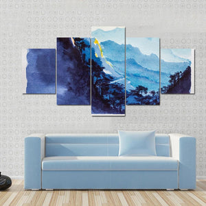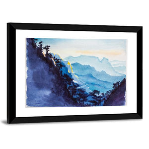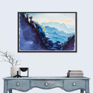 This watercolor canvas art features majestic mountains, valleys, and trees under a serene sky. Its atmospheric composition captures the beauty of nature, with trees clinging to steep cliffs and sunlight illuminating the mountain peaks.