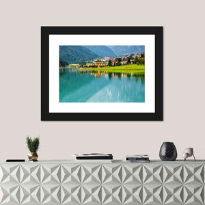Village With Lake Auronzo depicts a village nestled beside a calm lake with tree-lined mountains and a clear reflection in the water. Rendered in blues, greens, browns and whites with a rule-of-thirds composition, it creates a peaceful, picturesque mood that fits nature-inspired or modern interiors.