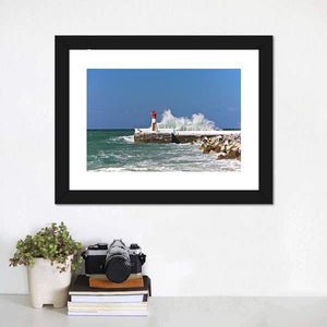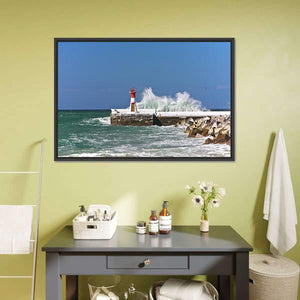 This realistic landscape shows a red-and-white lighthouse on a rocky pier, with crashing ocean waves and stormy skies that create a dramatic, powerful scene. The energetic coastal mood suits modern or travel-inspired rooms and works well as a focal wall piece in living areas or hallways.